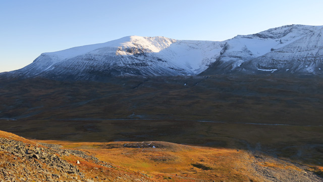 Pältsanvaggi – Kilpisjärvi Korkeuskäyrä Pältsanvaggi – KilpisjärviHerätys klo 05:00, oli vielä melko hämärää, otsalampun valossa laittelin aamupalaksi Reiter aterian, lisäksi join kahvi-kaakaota ja söin leivät juustolla ja metvurstilla sekä pullan. Kylmää oli, en viitsinyt heti tulla pois makuupussista, vaan lepäilin aterioinnin päälle ja siiten keräilin ja pakkailin tavaroita puoliksi pussissa ollen. Sitten piti makuupussitkin pakata. Lopulta piti märät fleecehousut ja tuulitakki laittaa päälle, niiden päälle laitoin teltan purun ajaksi kuorivaatteet. Teltta oli kuurassa, sain sen kuitenkin pakattua, lopuksi sulloin kuoriasunkin rinkkaan ja sidoin kengännauhat kiinni. Klo 08:38 lähdin kävelemään, aurinko paistoi hieman edestäpäin, Tuipalin ylängön päällä lepäsi pilvi. Kävelyn aikana piti toistuvasti ottaa valokuvia aamuauringon valaisemista tuntureista.