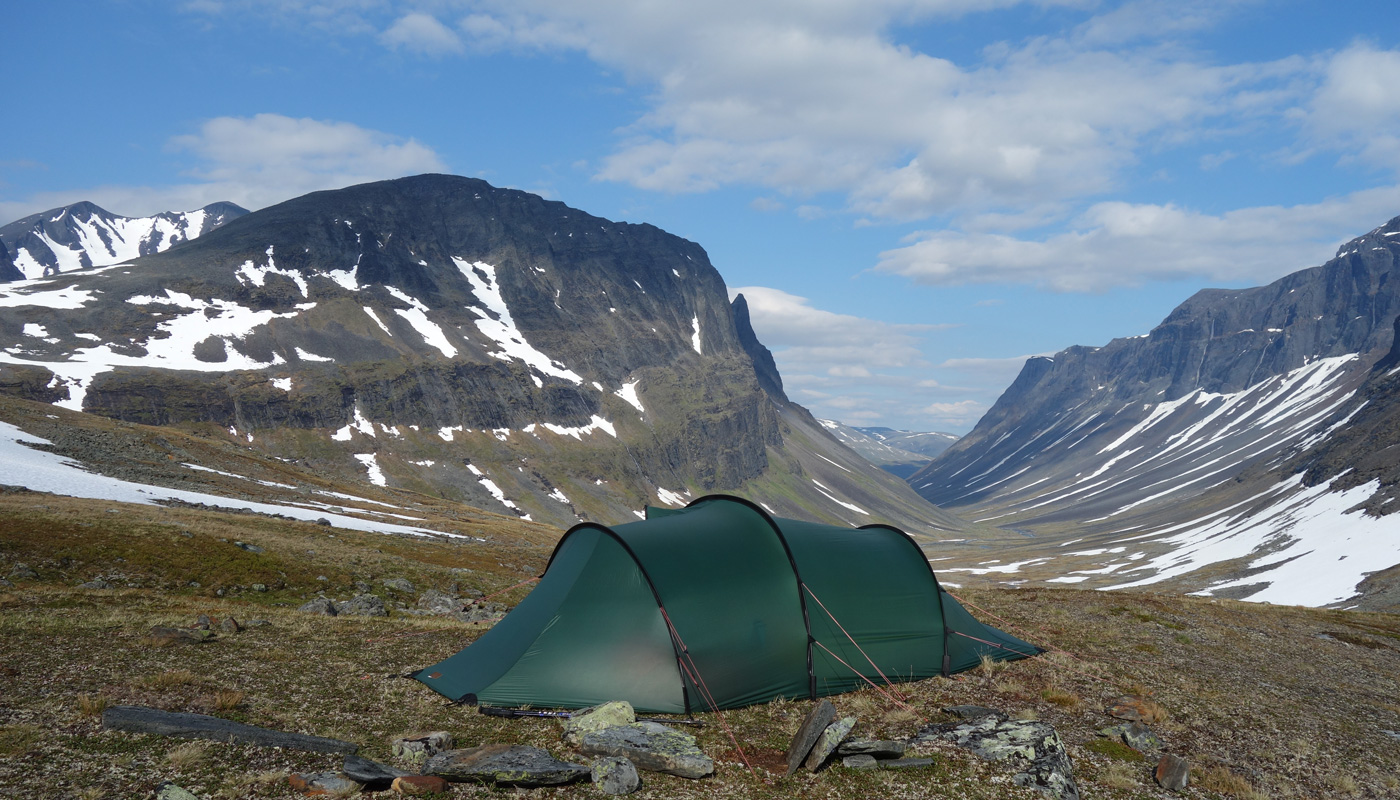 Pidimme patukkatauon. Yhden puron ylityksessä toinen kenkä vähän kastui. Jatkoimme vielä Geargevaggin länsipäähän, mistä 1094 m korkeudelta löytyi hyvä teltan