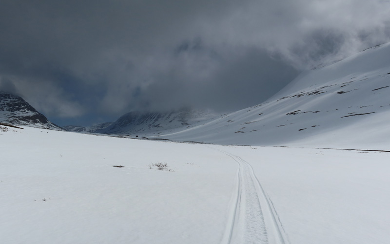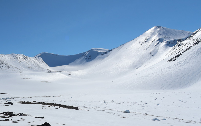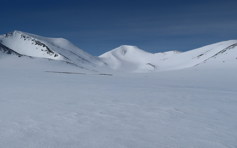 Päätin lähteä hakemaan pidemmät sukset sieltä, minne olin ne jättänyt, GPS:n mukaan matkaa oli 4,30 km linnuntietä. Laitoin kesätunturisukset jalkaan ja klo 09 aikaan lähin nousemaan laakson rinnettä viistosti ylöspäin. Arvelin, että siellä täytyi olla paremmin lunta, koska porovartijat olivat sitä kautta kulkeneet moottorikelkoilla. Saavutin pian kelkanjäljet ja nousin niitä pitkin ylös. Ylempää löytyikin hieman loivempi alue, ikään kuin pitkittäinen hylly laaksoa reunustavassa rinteessä, lumi jatkui siinä yhtenäisenä yli kahden kilometrin matkalla. Kovalla hangella kesätunturisuksi toimi hyvin ja etenin kevyesti tasatyönnöllä hieman alaspäin viettävällä hyllyllä. Lopuksi tuli jyrkempi lasku, jonka menin sivuttain liukuen. Sitten lumi loppui, otin sukset kantoon ja kävelin rinnettä alas kilometrin verran. Katselin samalla, olisiko puroja, jotta saisin vettä pussiin, mutta niitä ei ollut. Pääsin sitten pitempien suksien luo, jätin kesätunturisukset siihen, otin pitkän sukset kantoon ja nousin samaa reittiä sinne, mistä lumi alkoi. Nousin ensiksi hyllylle, otin sitten nousukarvat pois suksista ja hiihtelin rauhallisesti pari kilometriä. Lopuksi laskin rinteen viistosti alas teltalle. Reissua kertyi 9,25 km ja nousumetrejä 373. Teltalla keittelin kahvi-kaakaota ja söin suklaapatukan ja keksejä. Vesi oli nyt lopussa ja lisää pitäisi saada. Ympärillä maisema oli lumen peitossa, puroja ei näkynyt. Lunta voisi tietysti sulattaa vedeksi keittimellä, mutta ahtaassa teltan eteisessä voisi se olla melko työlästä. Vähän matkan päässä teltalta alarinteen puolella oli lumella vihertävän sinertävä kohta. Aikaisemmilla vaelluksilla olin oppinut, että sinertävällä lumella ei kannata kävellä, siellä voi olla vettä alla. Nyt lähdin katsomaan, olisiko näin tällä kertaa. Kaivoin lapiolla pienen kuopan lumeen, ja se täyttyikin aika pian vedellä. Lapioin tästä pussin ja juomapullon täyteen vettä. Nytpä olikin vesihuolto-ongelma ratkaistu, auringon paisteessa lumi sulaisi ja vesi kuopassa vain lisääntyisi. Lähdin sitten vähän hiihtelemään, nousin Nissonvággin länsipuolen rinnettä viistosti ylöspäin ja pääsin Gaskariehppiin aina 1131 m järvelle saakka. Täällä olin telttaillut vuonna 2023. Ylhäällä oli tuulta aika lailla. Söin suklaapatukan. Voimavarat eivät nyt riittäneet siihen, että olisin noussut ylemmäksi tunturin huipulle saakka, joten tyydyin ottamaan muutamia valokuvia, sitten käännyin takaisin päin.