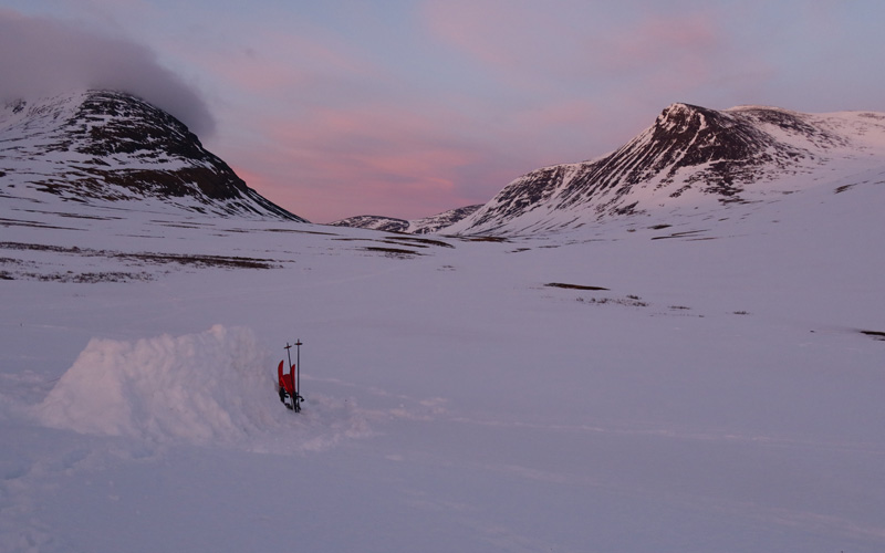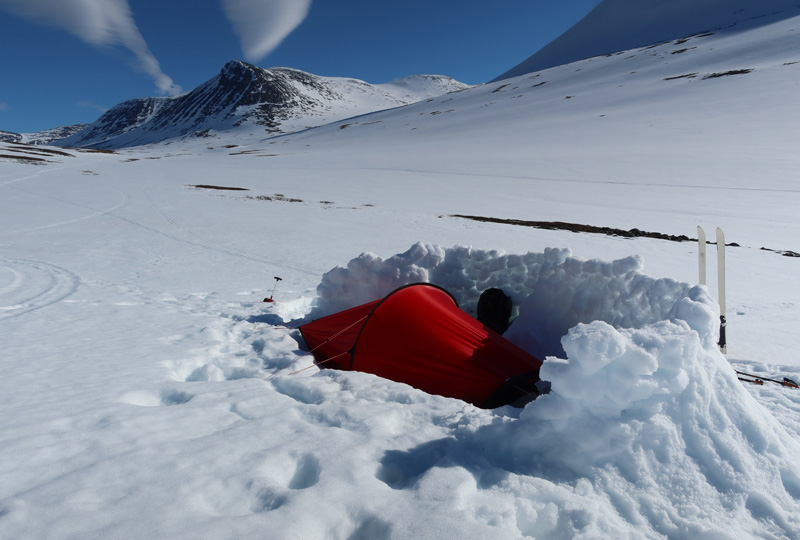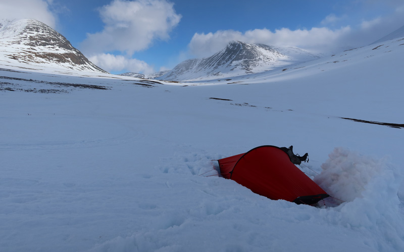 Istahdin tuvan portaalle tauolle ja korjaamaan vähän temppuilevaa suksen sidettä. Pian paikalle ajoikin etelän suunnasta porovartija moottorikelkallaan ja pysähtyi. Keskustelimme siinä sitten erinäisistä asioista, joista olennaisimmiksi jatkon kannalta muodostuivat tämän hetkinen ympäristön kantokyky suhteessa kesätunturisuksien pituuteen sekä illaksi luvattu tuulen yltyminen. Koska pystyin havaitsemaan, että laaksossa ainoa tuulensuojaa tarjoava kohouma oli se törmä, jolle porovartijain tupa oli rakennettu, kysäisin, sopisiko telttailla tuossa törmän alapuolella. Rouva tuumasi, että sopiihan se. Pian paikalle kelkkaili rouvan puolisokin ja keskustelimme vielä suksieni pituudesta ja kuinka niillä ei tunturissa pärjää. Seikkailunomaisena piti hän retkeäni tunturiin. Tuulen sanoi hänkin yltyvän ja suositti lapioimaan kunnolla suojaa teltalle. Sitten porovartijapariskunta lähtikin kelkkoineen kohti Abiskoa. Olin jo aiemmin päässyt käsitykseen, että talvivaelluksessa pitää olla lapio, joten olin motonetista autolapion hankkinut ja sen tänne Nissonvággin kantanut. Kaivoin teltan mallisen kuopan lumeen ja tamppasin pohjan tiiviiksi, teltta on sen verran pieni, että kaivuu sujui nopeasti. Leväytin teltan pakkauksestaan tuuleen lepattamaan, kiinnitin tuulen puolen päädyn lumeen, laitoin kaaren paikoilleen, kiinnitin sitten toisen päädyn ja vielä sivut. Näin syvässä lumessa eivät tavanomaiset telttakiilat olisi toimineet, mutta olinkin asiasta ennalta tietoisena siihen varautunut, olin sahannut kapeasta puisesta koristelistasta kymmenen noin 40 cm mittaista pätkää. Nämä toimittivatkin erinomaisesti talvikiilan virkaa ja sain teltan hyvin kiinni lumeen. Sitten lapioin teltalle lumesta tuulelta suojaavaa muuria, teinkin siitä aika korkean, ajattelin, että eivät tuommoiset karaistuneet ulkoilmaihmiset kuten porovartijat ihan pikkutuulesta varoittelisi. Klo 17:54 (Ruotsin aikaa) pääsin telttaan, olin kulkenut 11,9 km, nousumetrejä oli kertynyt 585. Telttana oli jälleen Akto, makuualustoina solumuovinen artiach light plus ja ilmapatja thermarest neoair xlite nxt lw, makuupussina kolmen vuoden ajan untuvapussi, 960 g. Ahdas on tämä teltta, rinkka ja kengät piti jättää ulkopuolelle.
