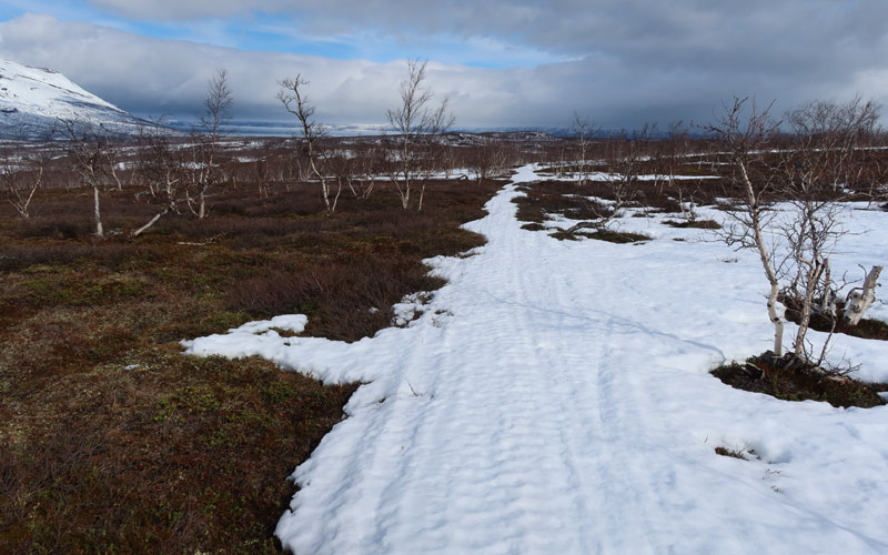 Nissonvaggi - Abisko Turist Korkeuskäyrä Nissonvaggi - Abisko TuristMaanantai 19.5.2025 heräsin klo 05 aikaan, yö oli ollut melko tuulinen, mutta tuulimuurin ansiosta ei se teltassa juuri tuntunut, kylmäkään ei ollut ollut. Sää oli nyt puolipilvinen. Söin Reiter aamiaisen ja sen päälle keitin kahvit ja söin keksejä ja suklaapatukan. Keräilin tavarani rinkkaan, lopuksi purin teltan. Olin laittanut nousukarvat suksiin jo illalla ja klo 08:05 aikaan lähdin nousemaan rinnettä kohden Nissonvággin itärinteen hyllyä. Sitten hiihtelin tasaisella ja lopuksi laskin, kunnes lumi loppui. Nousukarvat jarruttivat laskussa sopivasti, ei tullut liikaa vauhtia. Otin sukset kantoon ja kävelin reilun kilometrin verran, kunnes pääsin kesätunturisuksien luokse. Kiinnitin ne rinkan kylkiin, vein sitten pitkät sukset sinne, missä lumi taas alkoi, hain vielä rinkankin, sitten laitoin sukset jalkaan hiihdin, jos oli lunta ja kävelin sukset jalassa, jos ei ollut lunta. Saavutin sitten moottorikelkkauran ja päätin seurata sitä enkä lähteä umpihangessa kohti Bajip Njáhkájávria. Kelkkauralla olikin lunta melkein koko matkalla, vain jotkin suokohdat olivat lumettomia. Saavutin merkityn kelkkareitin ja etenin sitä pitkin, sitten hiihdin Padduksen luontopolkua.